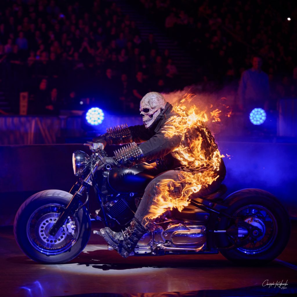 Je deviens Ghost Rider le temps de ma prestation. Entièrement en flammes et ma moto enflammée, j’offre un show visuel unique qui mélange puissance, feu et mise en scène spectaculaire.